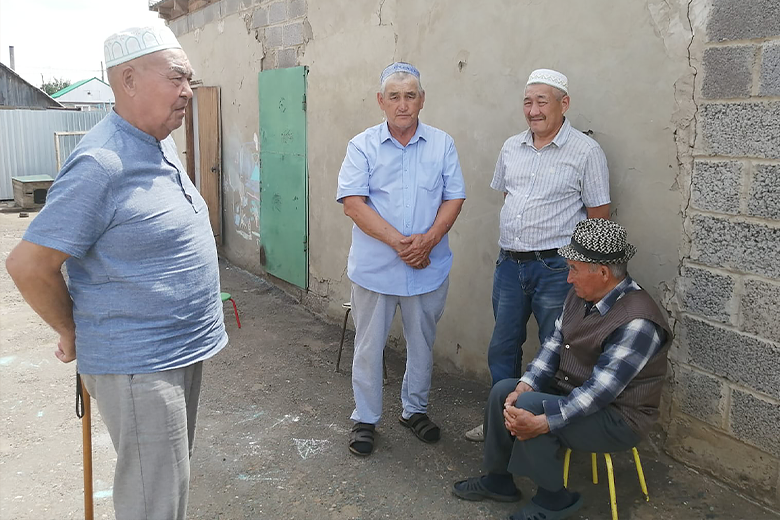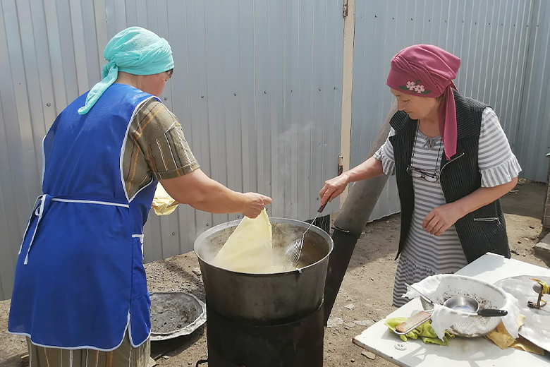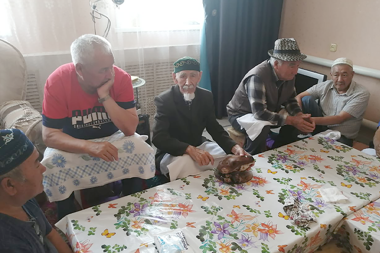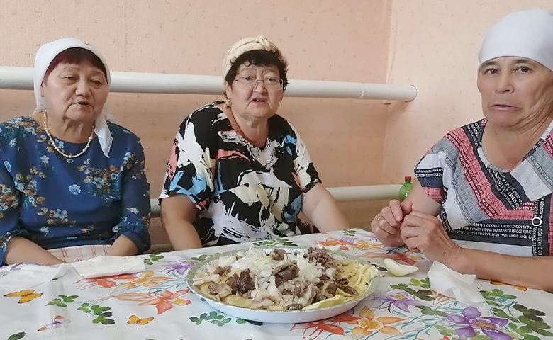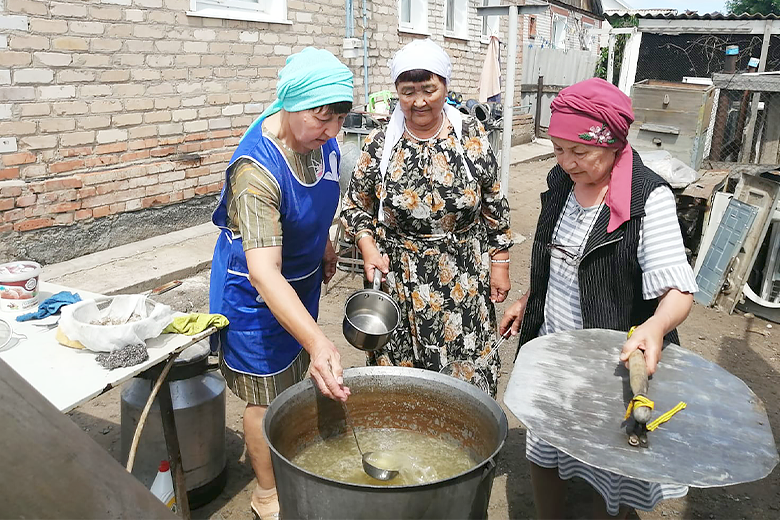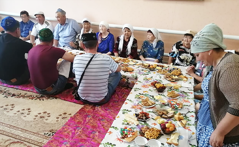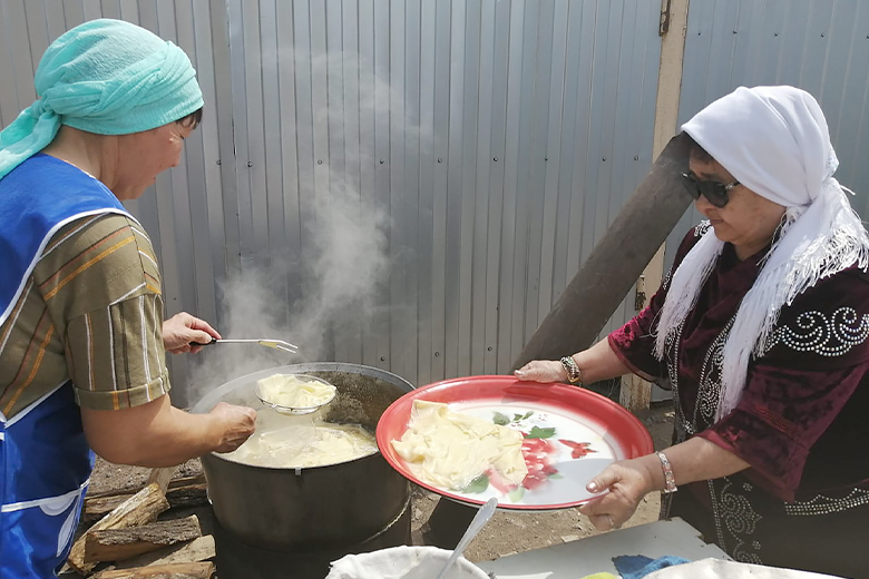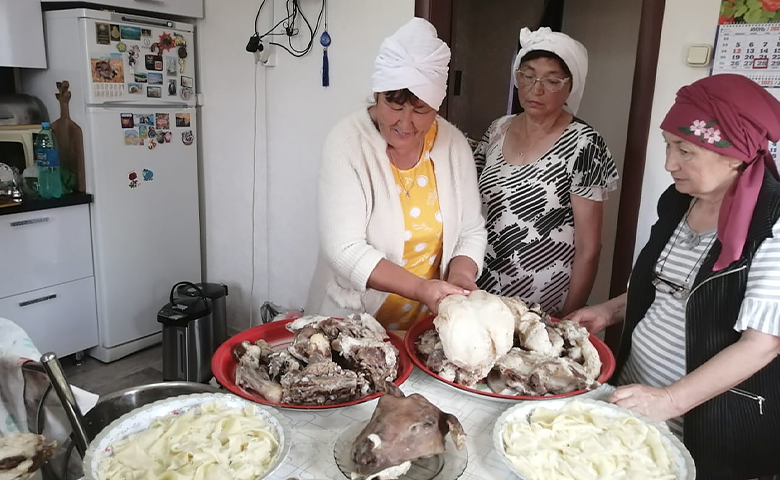 Сегодня в семь часов утра мужчины собрались в строящемся здании мечети на праздничный молебен – намаз. Затем был совершен обязательный обряд жертвоприношения, мужчины приготовили мясо баранины для приготовления национального блюда. У женщин также шла подготовка к празднику – пекли лепешки щельпек, именно с них начинается праздничная трапеза, баурсак и катали лепешки для бешбармака.