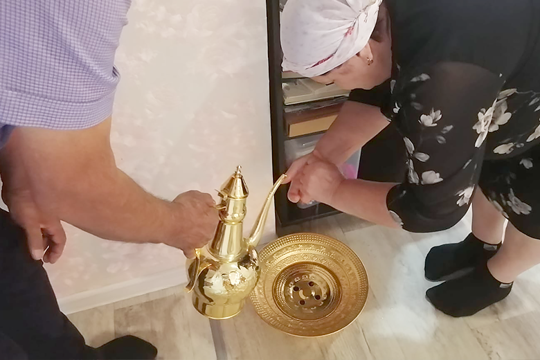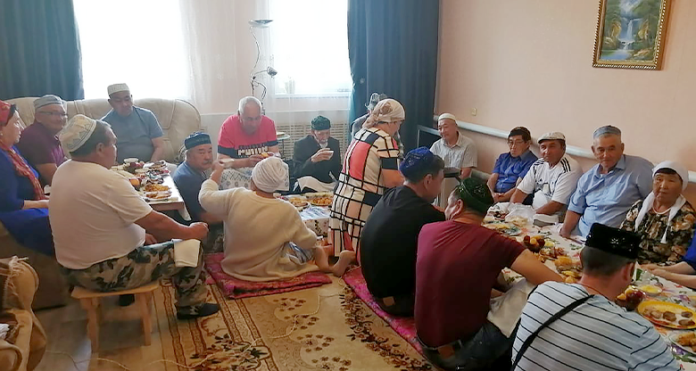 К полудню стали собираться гости в доме, хозяева которого пригласили людей первыми. Перед тем, как сесть на пол за накрытый дастархан, гости прошли обряд омовения рук. Хозяин поливал воду на руки из кувшина – кумана. Мужчины и женщины садятся отдельно, в разных концах «стола».