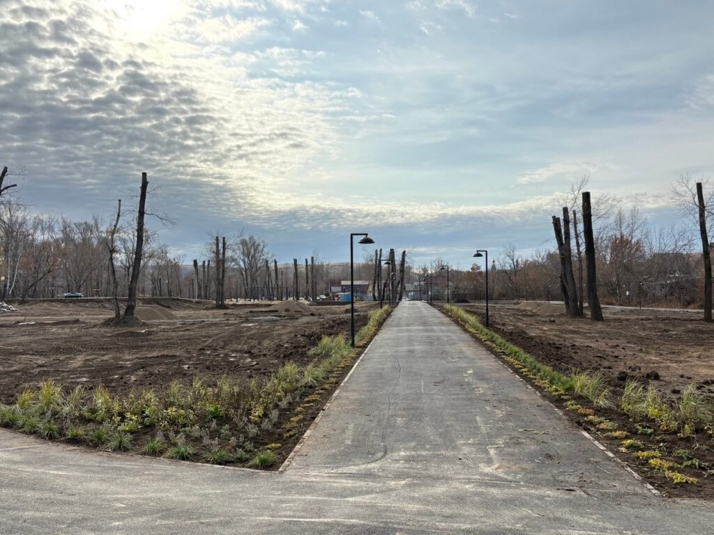 Уже привлекает внимание обустроенная набережная вдоль реки Кураганка: выполнены сцены, заасфальтирована спортивная площадка, большая часть пешеходных и велосипедных дорожек. Устанавливаются различные малые архитектурные формы. Устраиваются терренкуровые тропинки. Завершаются работы на парковочной зоне, рядом укладывается брусчатка.